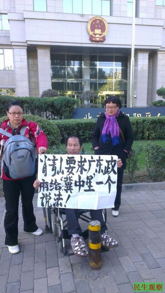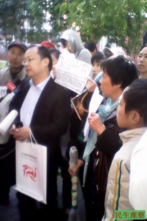 今天上午有彭中林等一百多名访民在朝阳法院外声援冀中星,黑龙江访民在法院外抛洒了她准备的二千多份传单,以示抗议,不少访民接受媒体采访。另维权人士肖青山今天也到现场举牌抗议。因在场有不少中外媒体采访,警察没有动粗和抓捕现场访民。